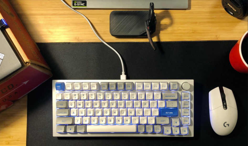 Mousepad/keyboard mat/drink holder all wrapped into one… the convenient desk mat. I prefer around a 12″x24″ desk mat with my 75% keyboard. You may want to opt for a larger size if using a 100% keyboard.