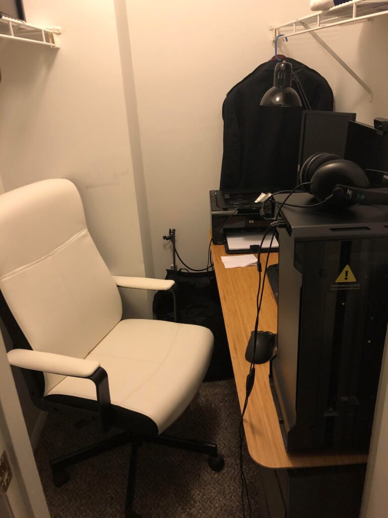 We relocated and had to disassemble everything to get it in the closet. We reassembled the desk and office chair in the closet, and fortunately everything fit. What we didn’t expect is that during the pandemic I’d be 100% remote and cooped up in a closet 40+ hours a week, but I’ll save that story for another time.